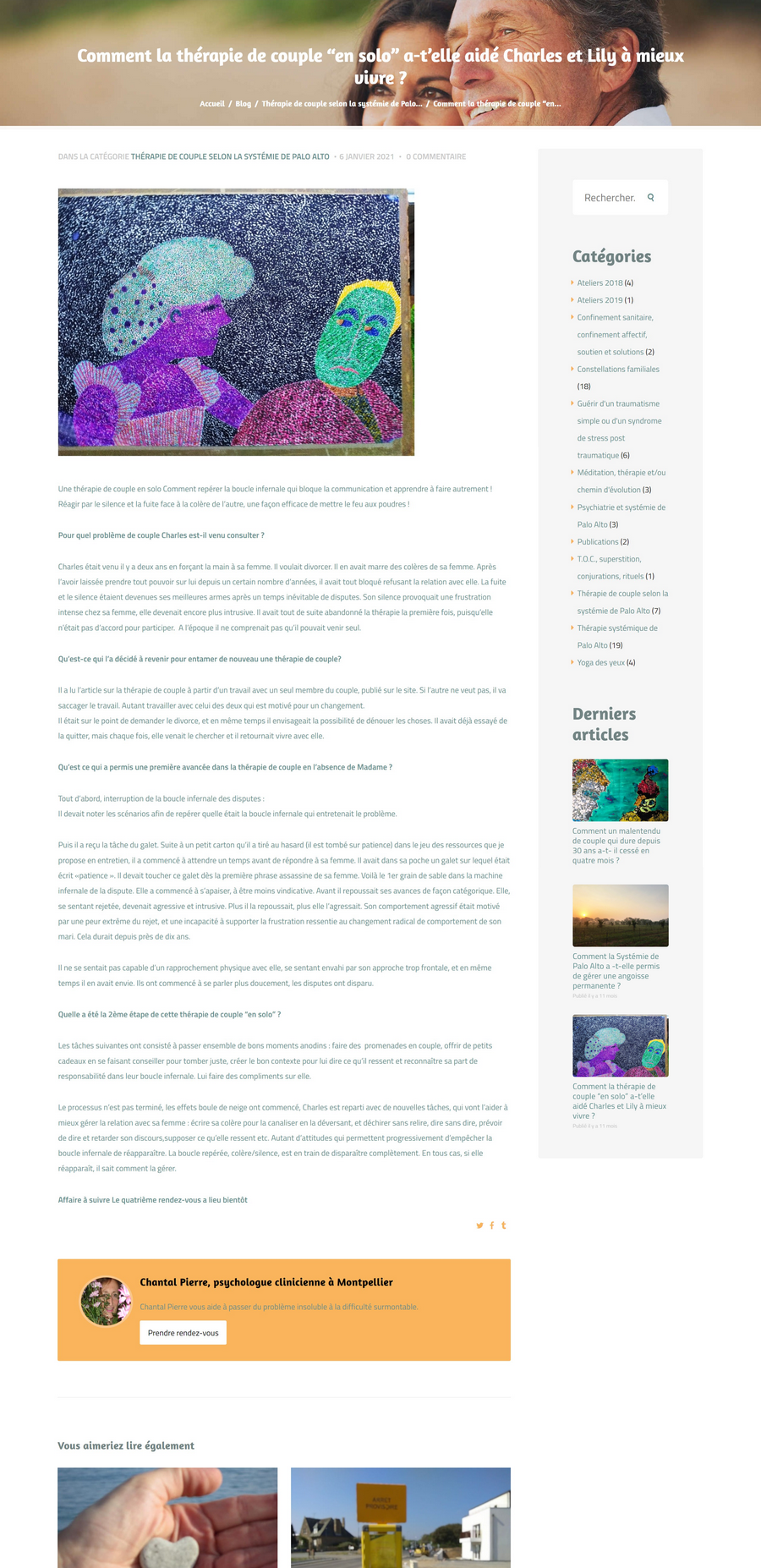 Au début de mon travail, j'ai migré le contenu en entier afin de reconstituer une structure harmonieuse et de qualité pour le référencement naturel. J'ai ainsi eu l'occasion de lire en diagonal chacun des articles pour m'imprégner de l'univers de Chantal et de comprendre la constitution de sa ligne éditoriale.
